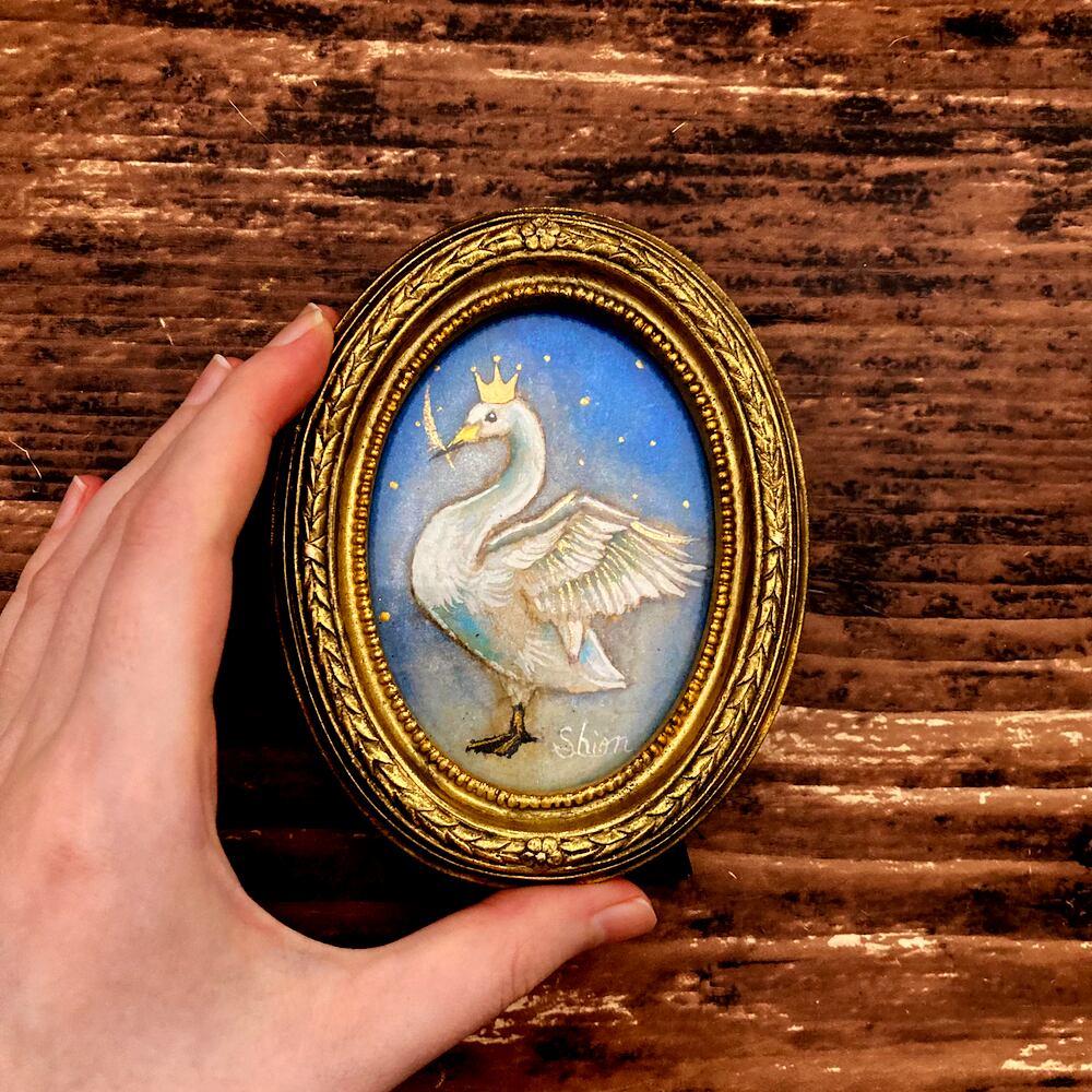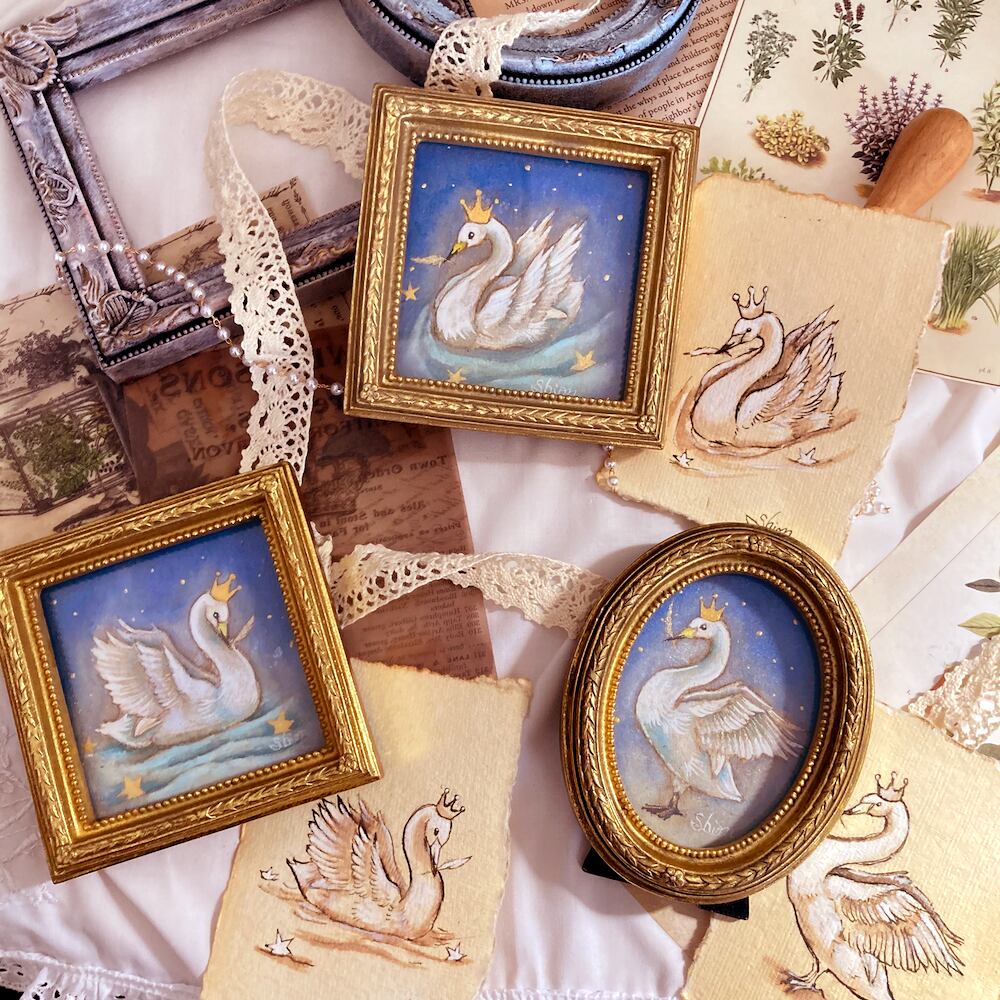 湖に住む白鳥の王さまをテーマに描いた小さな絵画です。