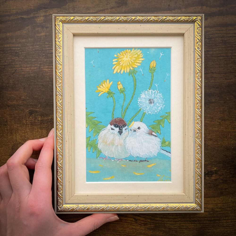 春らしい澄んだ空色をバックに、仲睦まじげなスズメとシマエナガを描きました。