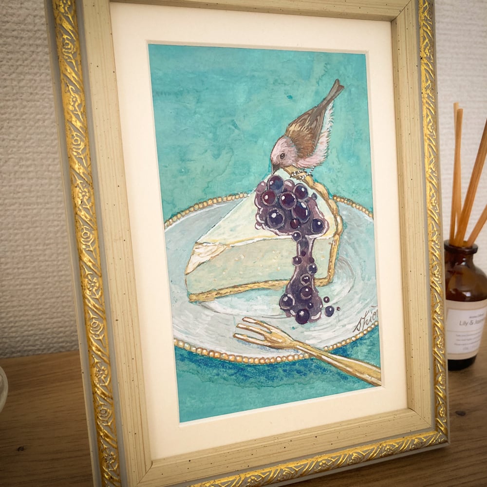 滑らかでずっしりとしたチーズケーキの質感は、さまざまな色味の絵の具えお塗り重ねることで表現しました。